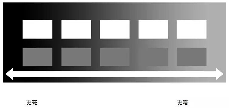 AMOLED的对比度要远远高于LCD,LCD一般为1000:1,AMOLED至少为10000:1。显示图像的对比度越高,人眼视亮度感觉越强烈。(视亮度:人眼对于亮度的感觉。对比度越高,人眼对于视亮度感受越强烈。)如下图,图中每一行的亮度是一样的,但因为对比度不同,所以造成了人眼视亮度不同,左边的就会感觉更亮,右边的就会感觉比较暗。