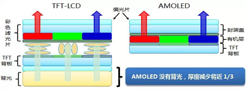 AMOLED具有自发光的特性,所以无需任何背光源,与LCD相比厚度减少将近1/3。而且结构相对简单,由上下两层玻璃加上中间有机材料层,最终组成类似三明治结构的AMOLED显示屏。
