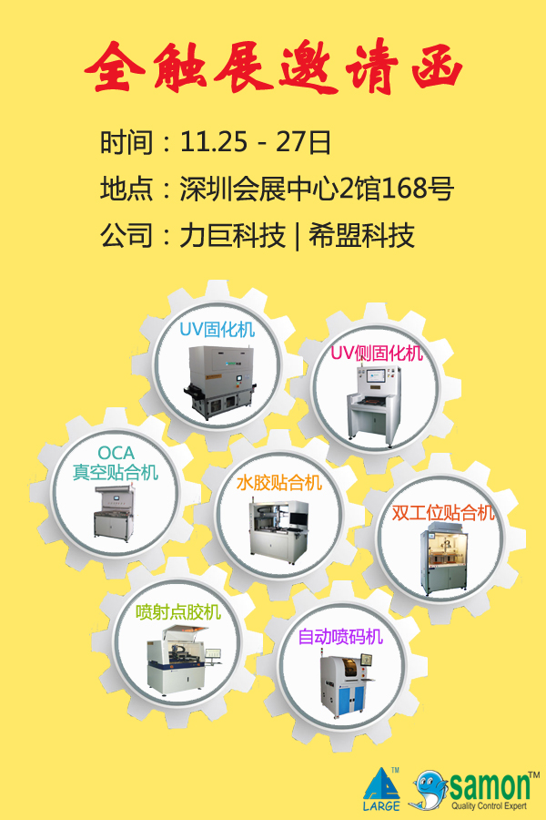 在此次全触展展会现场,一个亮丽的展台引起很多客户的围观——力巨/希盟科技。力巨/希盟科技的水胶全贴合机、UV固化机、OCA真空贴合机、喷射点胶机、点胶贴合流水线、UV侧固化机、自动喷码机等几类触摸屏设备吸引了众多触摸屏客户的咨询,并给予极大地认可!想了解更多关于这款设备的信息吗?请前往深圳会展中心2号馆2A168力巨展位,更多精彩资讯和礼品等您来!