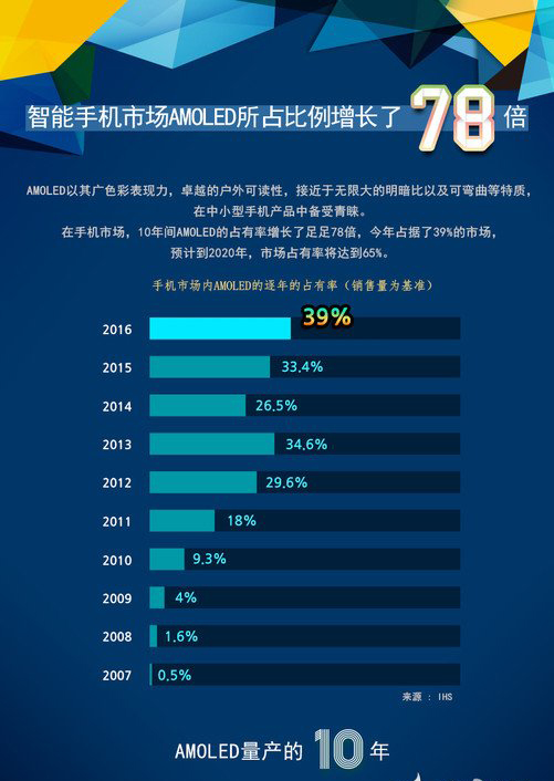 来自IHS Tecnology的分析主管提供的数据表示,三星在OLED(AMOLED)面板这一领域的技术至少领先业界三年。而且,三星的OLED屏幕还在量产和良品率方面具有明显的优势。AMOLED屏幕是三星自家生产的OLED屏幕对外宣传时所采用的名称,从2007年三星首度量产AMOLED屏幕成功之后,与TFT LCD屏幕采用不同发光方式的OLED就愈发受到智能设备的欢迎,尤其是由于其显示黑色时的省电特性,也被不少的智能设备所采用。